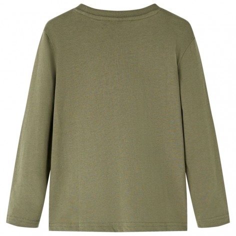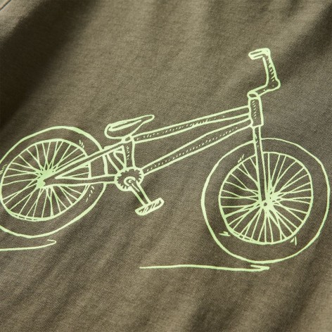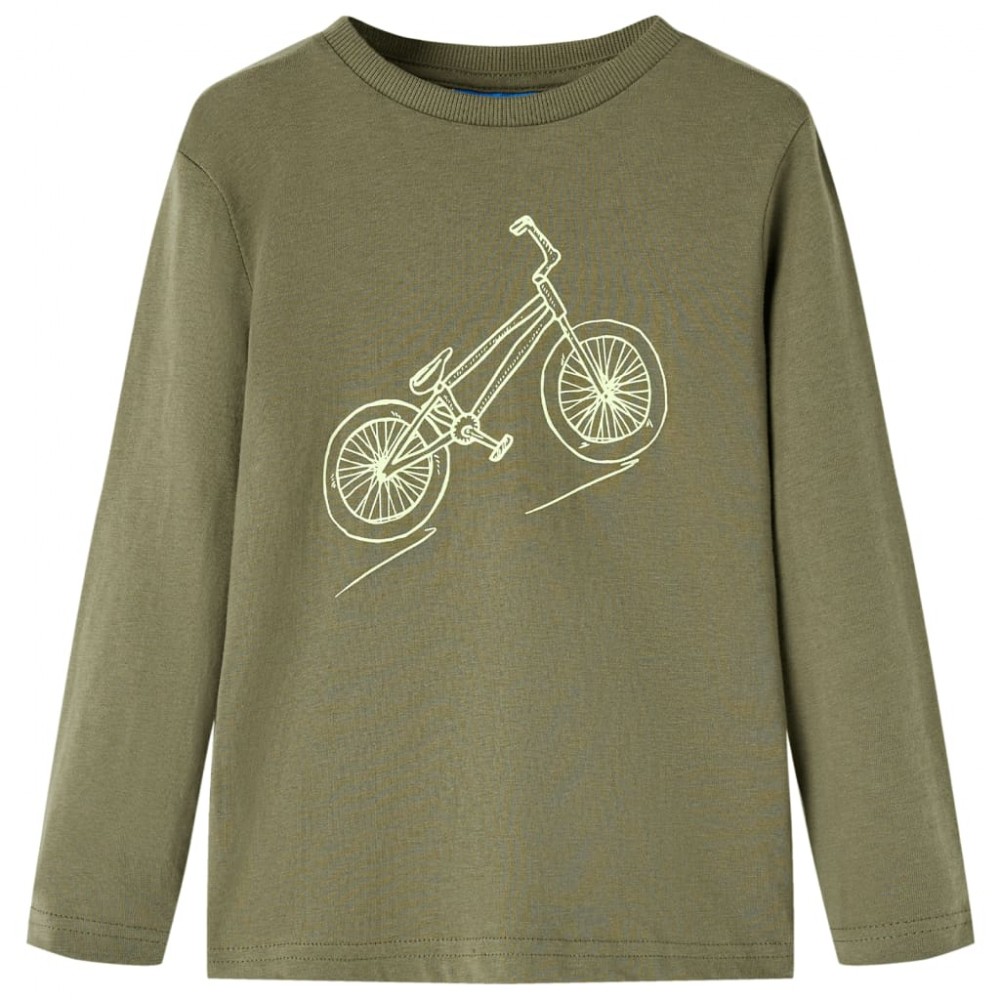 Questa maglietta per bambini ha maniche lunghe, girocollo, e un taglio dritto. Questa maglietta color cachi presenta una bicicletta. La maglietta a maniche lunghe per bambini è realizzata al 100% in cotone per conferire un tocco morbido e confortevole.