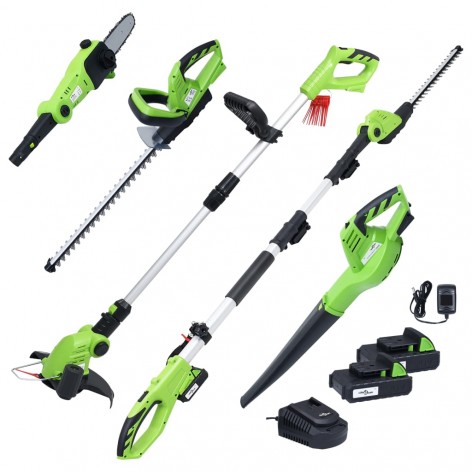 Questo set completo di elettroutensili da giardino, contenente un tagliasiepi, un tagliaerba, un soffiatore per foglie, un decespugliatore, una sega ad asta, 2 caricatori, e 2 batterie agli ioni di litio da 20 V 1500 mAh, vi consentono di svolgere facilmente i lavori in giardino.