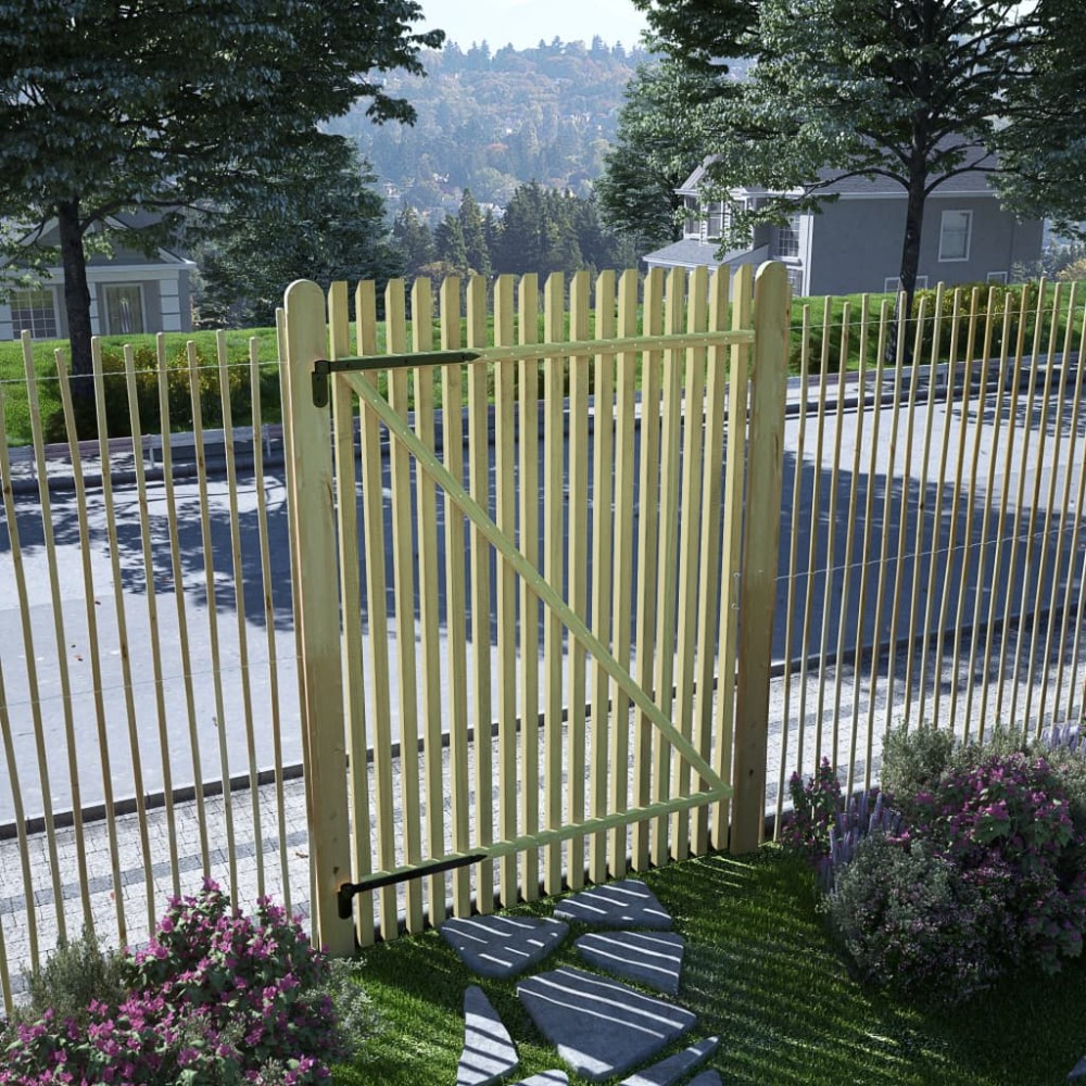 Questo resistente cancello da giardino con paletti è realizzato in legno di pino, che è rispettoso dell'ambiente. Il legno di pino impregnato è robusto e resistente alle intemperie e alla decomposizione. Il portone del recinto, realizzato con paletti verticali e traverse diagonali, è robusto, resistente e durevole.