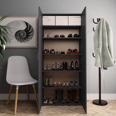 Realizzato in solido truciolato, questo armadietto è estremamente resistente e robusto. La scarpiera è dotata di 6 ripiani ed offre ampio spazio per mantenere le scarpe in ordine. Grazie alle 2 ante questo mobile protegge le scarpe dalla polvere e le nasconde alla vista.