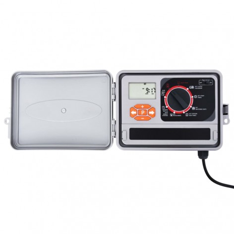 Il temporizzatore per l'irrigazione può controllare 4, 6, 9 o 11 valvole. Il regolatore di irrigazione dispone di 6 programmi di irrigazione e ogni programma ha la sua ora di inizio, ora di fine e tempo di esecuzione. Il programma di irrigazione può essere impostato per ogni giorno della settimana, con un determinato orario di inizio e di fine. Il tempo di esecuzione può variare da 1 minuto a 12 ore e 59 minuti in base alle proprie impostazioni. Il computer per l'irrigazione da giardino è alimentato a corrente alternata e può essere facilmente azionato con con il semplice utilizzo di un comando a rotazione e un pulsante per la selezione e la conferma dei dati. È presente una interfaccia per il collegamento di un sensore di pioggia o per un sensore di umidità (non inclusi in consegna) per evitare l'irrigazione e massimizzare il risparmio idrico durante i giorni di pioggia o quando il terreno è troppo bagnato. È inoltre necessaria una batteria alcalina da 9 V (non inclusa) per mantenere l'orologio digitale visualizzato sullo schermo e la memoria dei parametri registrati.