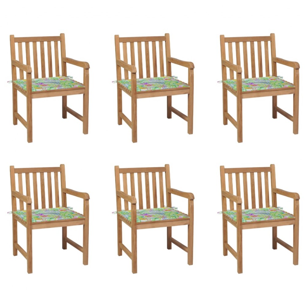 Sedie Giardino 6 pz e Cuscini Motivo a Foglie Massello di Teak
