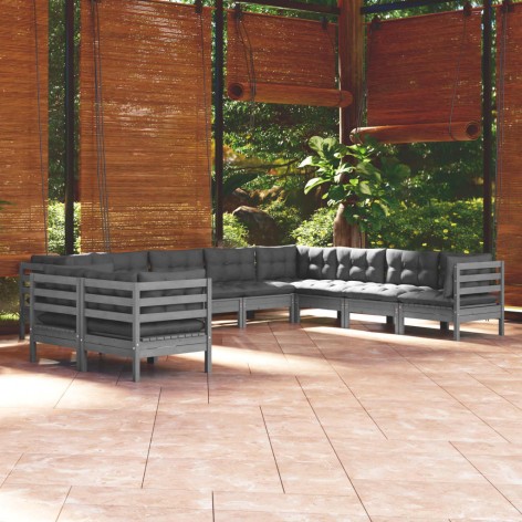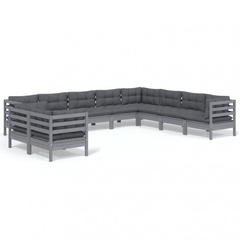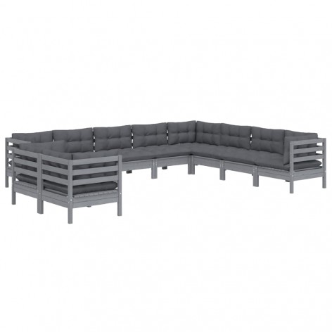 Set Divani da Giardino 10 pz con Cuscini Grigi Massello di Pino